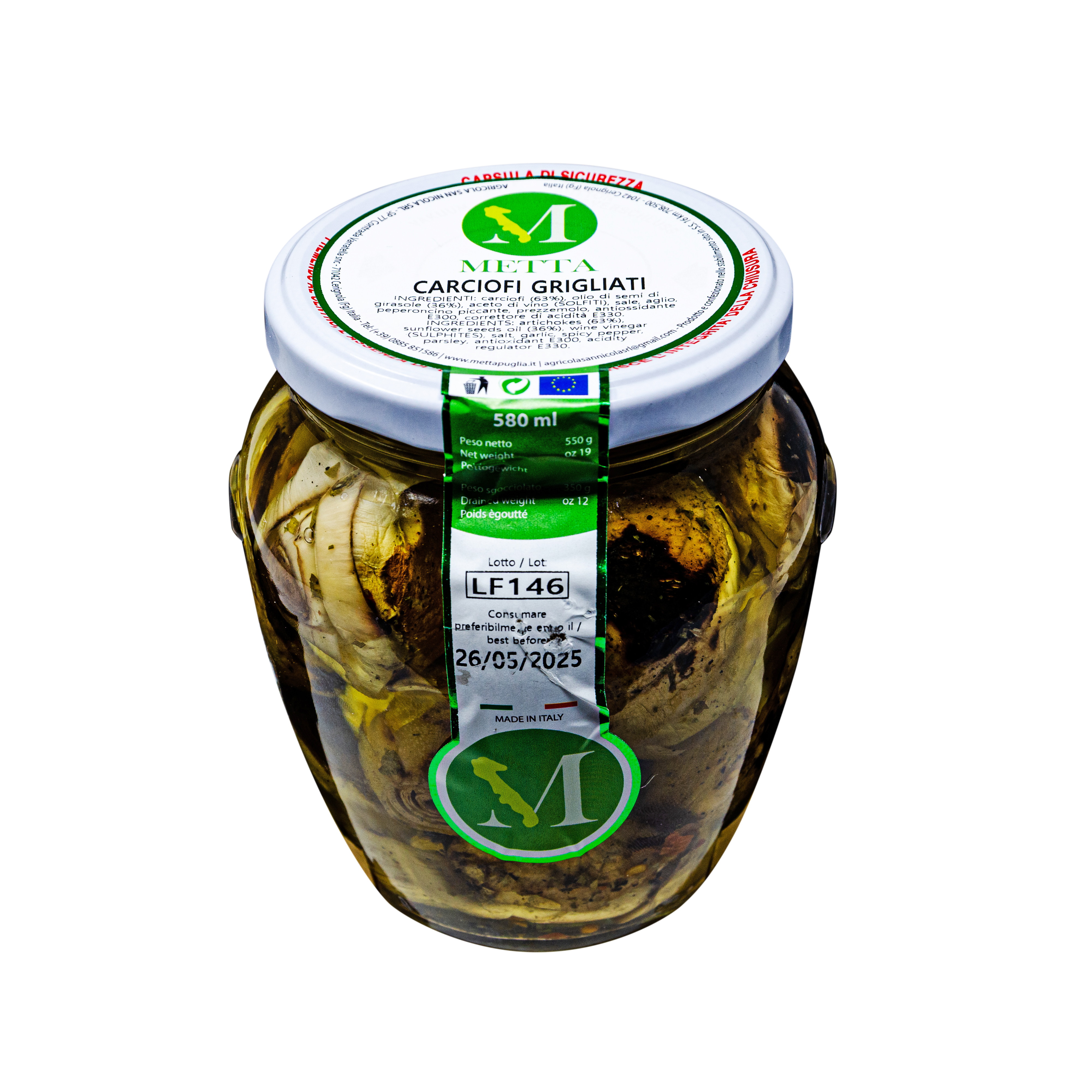Carciofi (62%), olio di semi di girasole (36%), aceto di vino, sale, aglio, peperoncino piccante, prezzemolo, antiossidante E300, correttore di acidità E330.