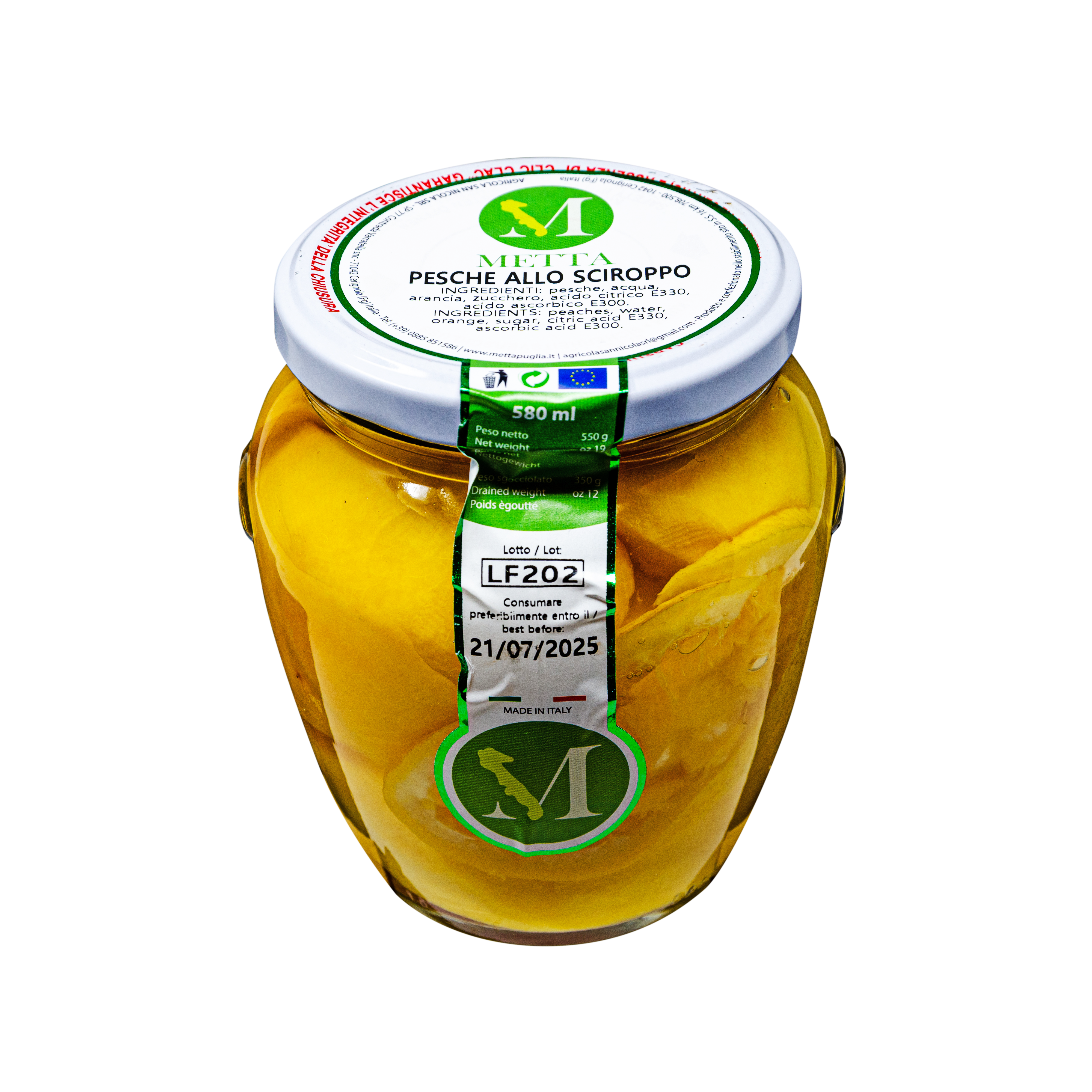 Pesche sciroppate, acqua, zucchero, arancia, ac. Citrico, ac. Ascorbico