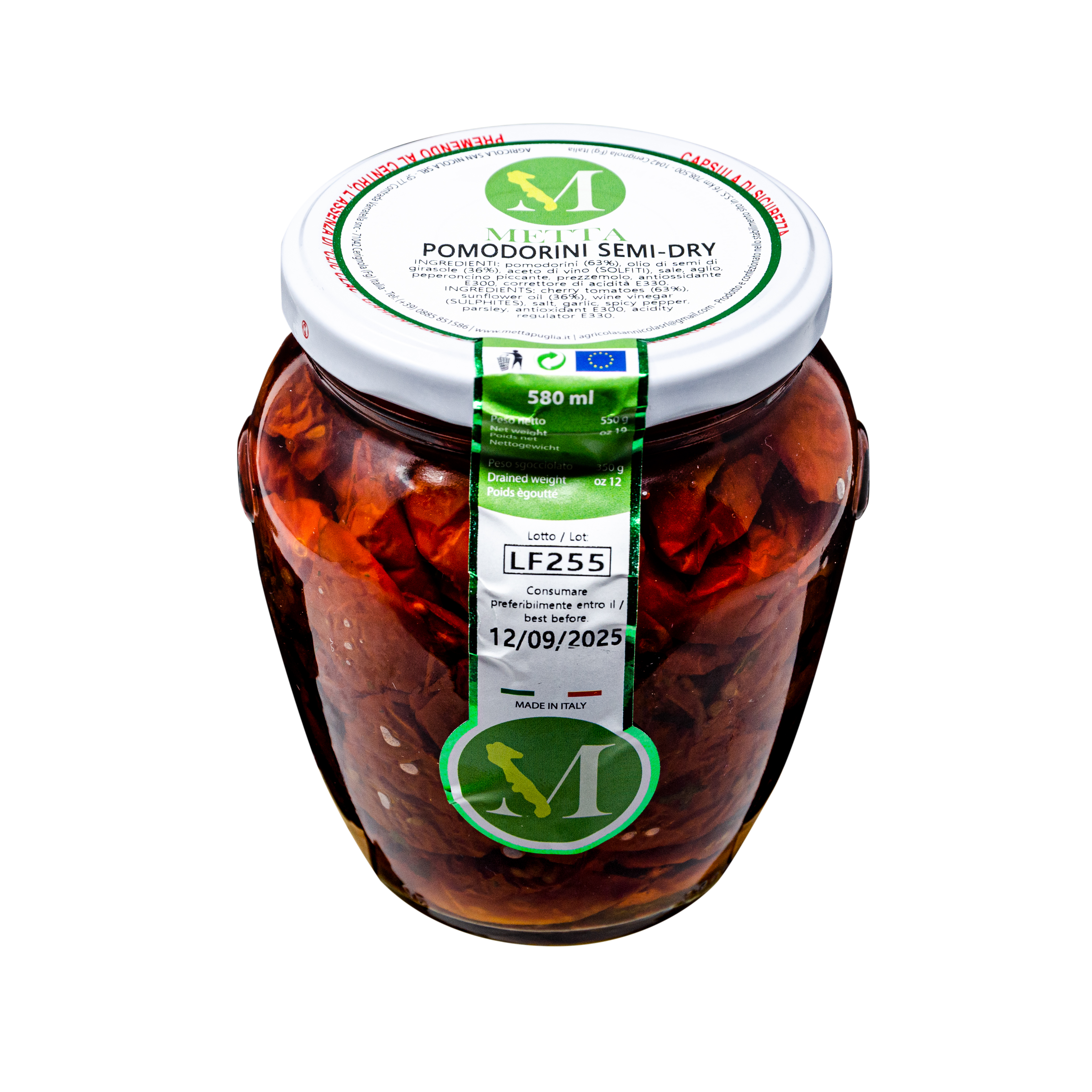 Pomodorini, olio di semi di girasole, aceto di vino, sale, aglio, peperoncino piccante, prezzemolo, antiossidante E300, correttore di acidità E330.
