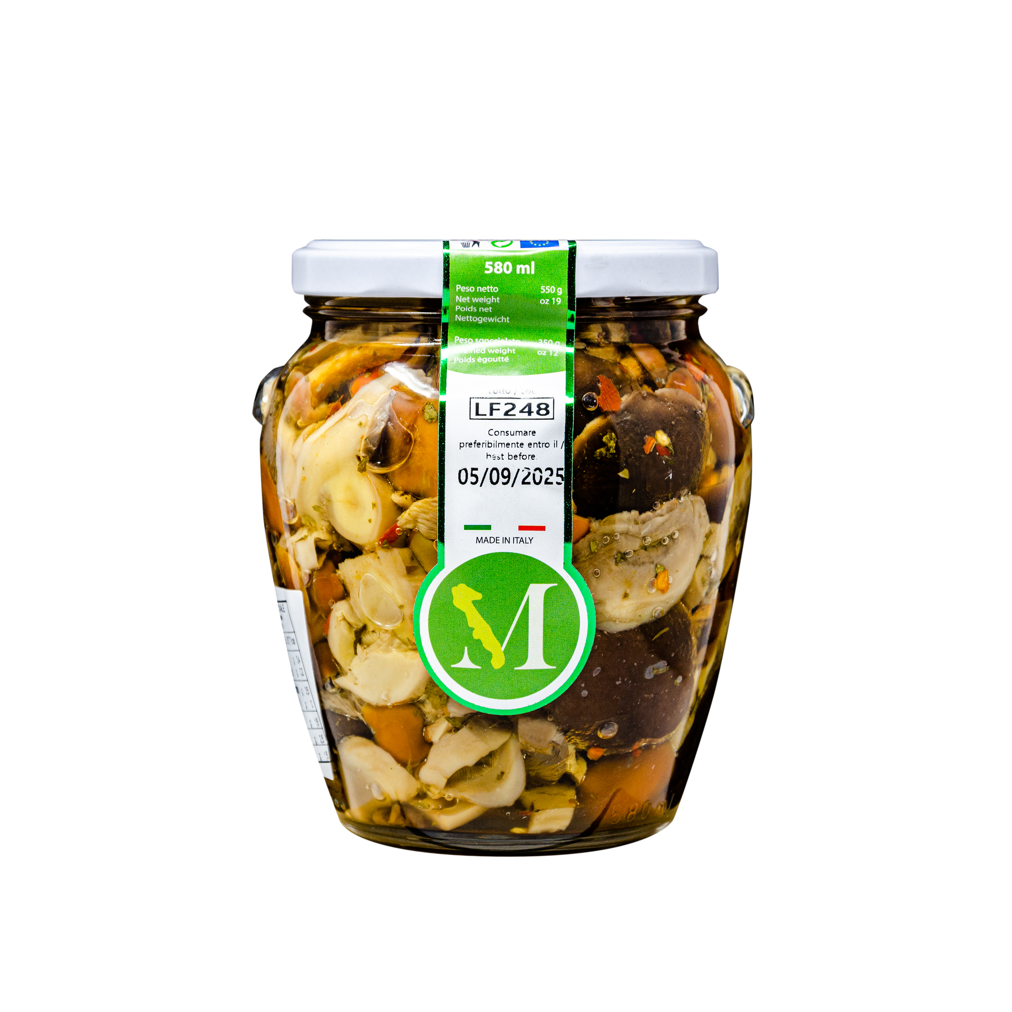 (Funghichampignon(Agaricusbisporus),funghishiitake(Lentinulaedodes),funghinameko(Pholitamutabilis))(63%),oliodisemidigirasole(35%),acetodivino,sale,peperoni,aglio,prezzemolo, peperoncino piccante, antiossidante E300, correttore diacidità E330